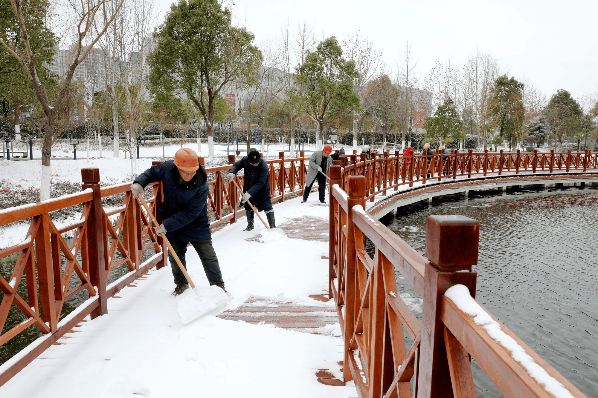 风雪之中,温暖守护也在同步进行。清晨六点半,东台市人民公园18名养护人员已冒着严寒,手持除雪铲、扫帚等工具,齐心协力铲除路面、亭桥等处积雪和暗冰。经过三小时连续奋战,上午九点半左右,公园主干道及重点区域积雪基本清除完毕,及时恢复了安全通畅的游览环境。
